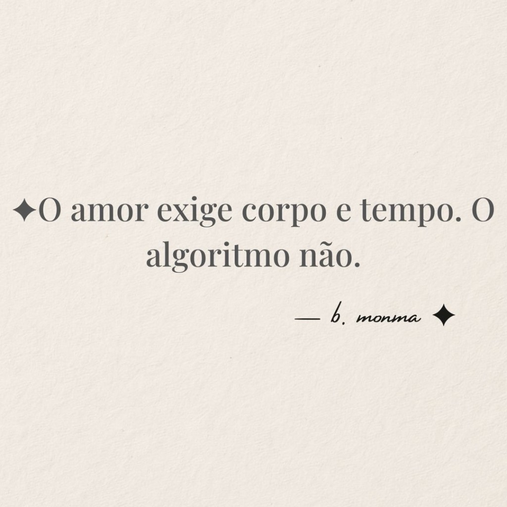 Não é que as pessoas não queiram amar, elas querem sim, desde que não demore, não complique, não exija presença demais e, de preferência, renda boas imagens. Amar virou algo que precisa ser mostrado, sentir já não basta. É preciso registrar, postar, legendar, provar. O amor saiu do espaço íntimo e entrou para a lógicaContinuar lendo “Amar na era do stories: o colapso do encontro” - O que cada geração fez com a própria dor